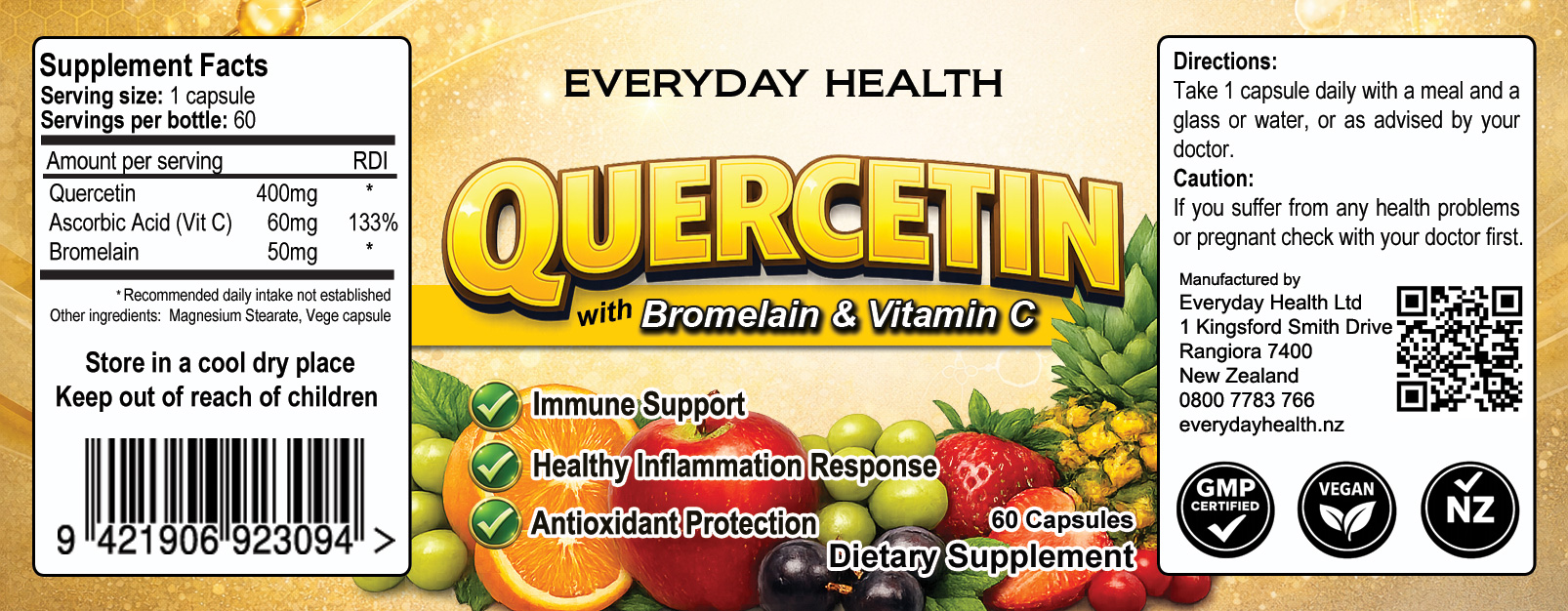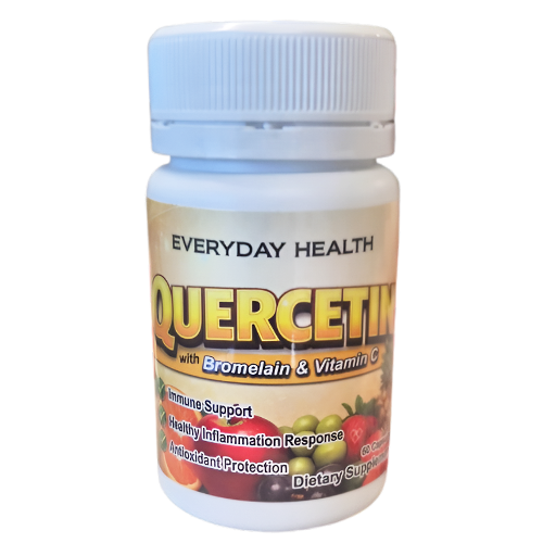 Each gelatin capsule contains 400mg of Quercetin (95% pure plant extract) with the co-factors vitamin C and bromelian.